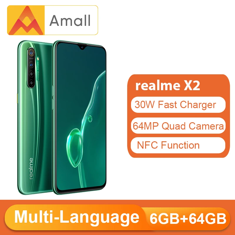 Best Price Comparison With realme X2 6GB 64GBGB Moblie Phone Snapdragon 730G 64MP Quad Camera 6.4'' NFC Cellphone 30W VOOC Fast Charger