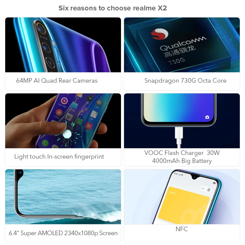 | realme X2 6GB 64GBGB Moblie Phone Snapdragon 730G 64MP Quad Camera 6.4'' NFC Cellphone 30W VOOC Fast Charger |