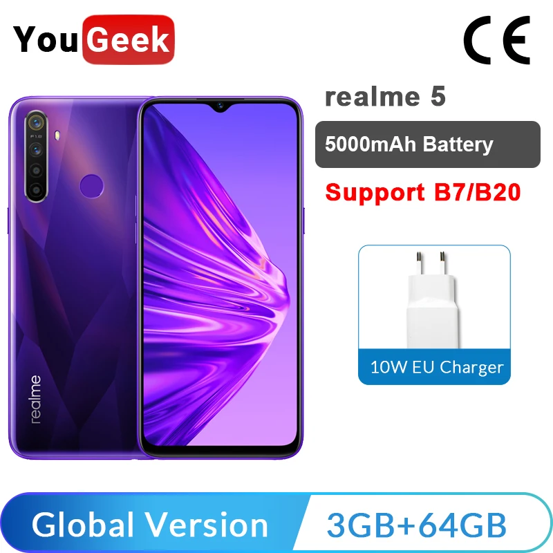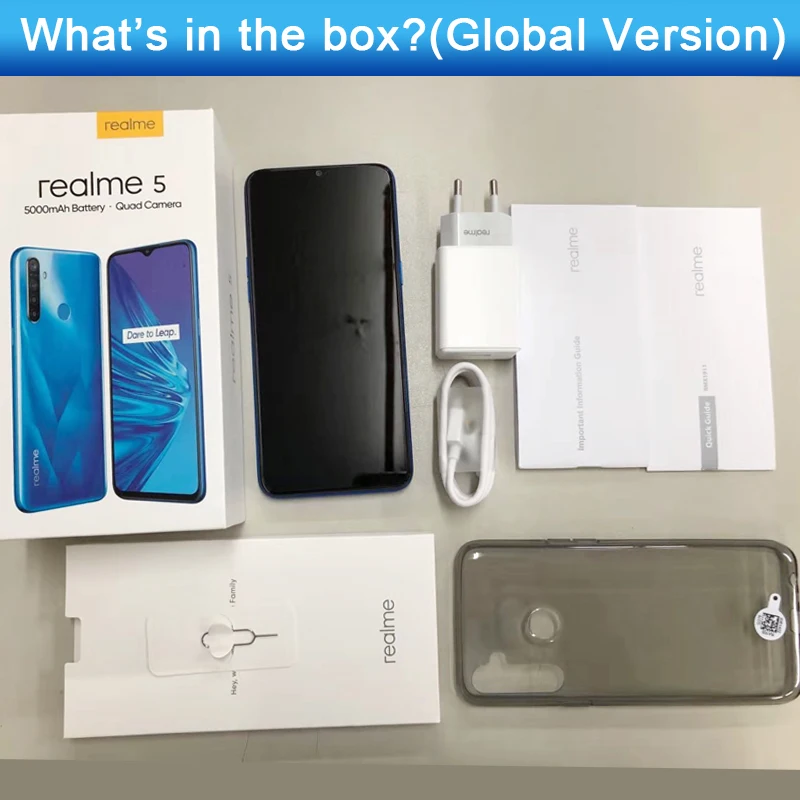 realme 5 Global Version 3GB 64GB 6.5'' Moblie Phone Snapdragon 665 12MP Quad Camera Cellphone 5000mAh VOOC 10W Fast Charger