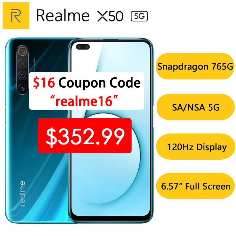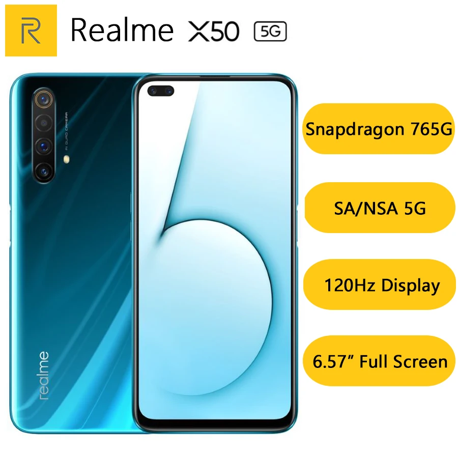 New Original Realme X50 5G Smartphone Snapdragon 765G 120Hz 6.57" Full Screen 64MP 6 Cameras 4200mAh 30W VOOC Flash Charge 4.0Buy Now On Aliexpress