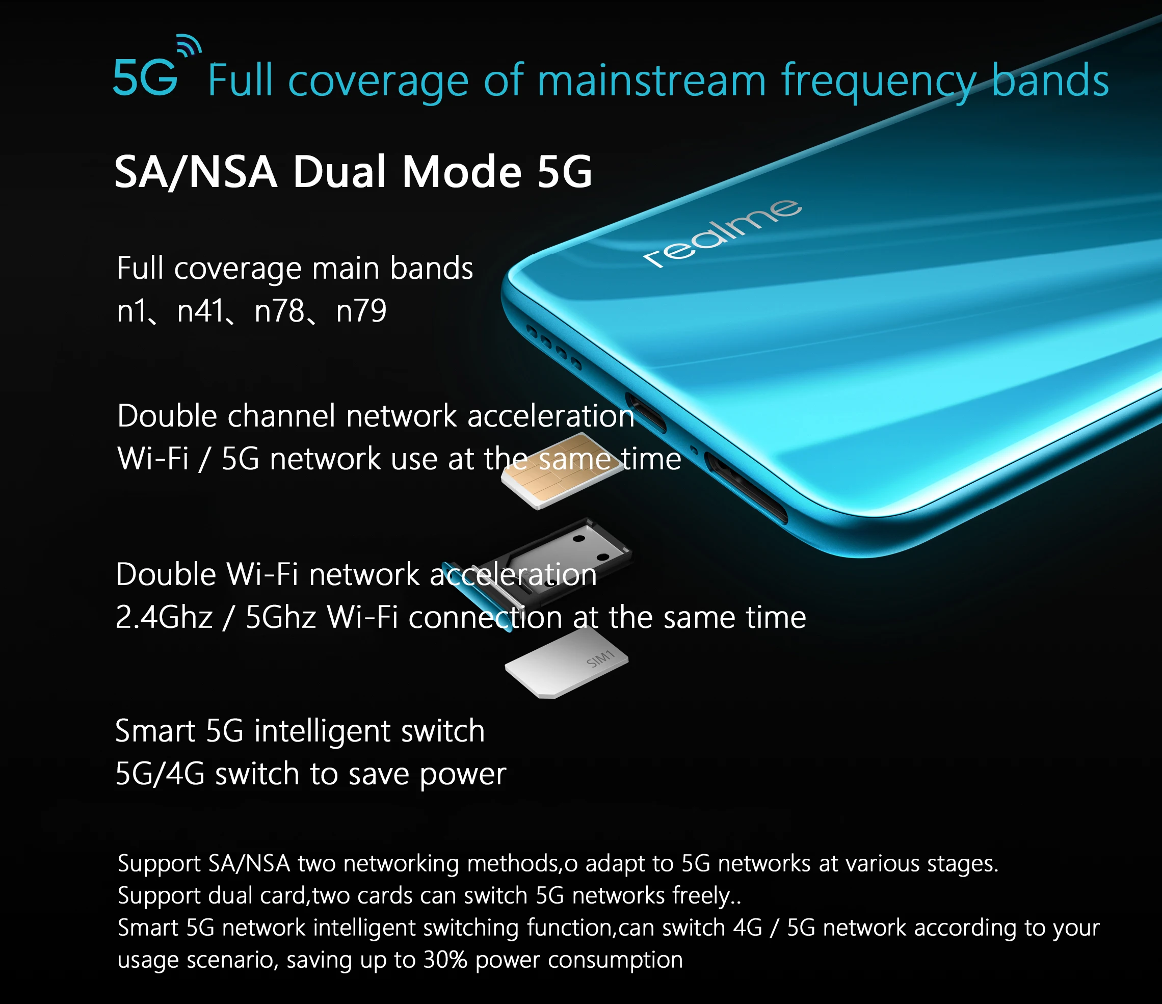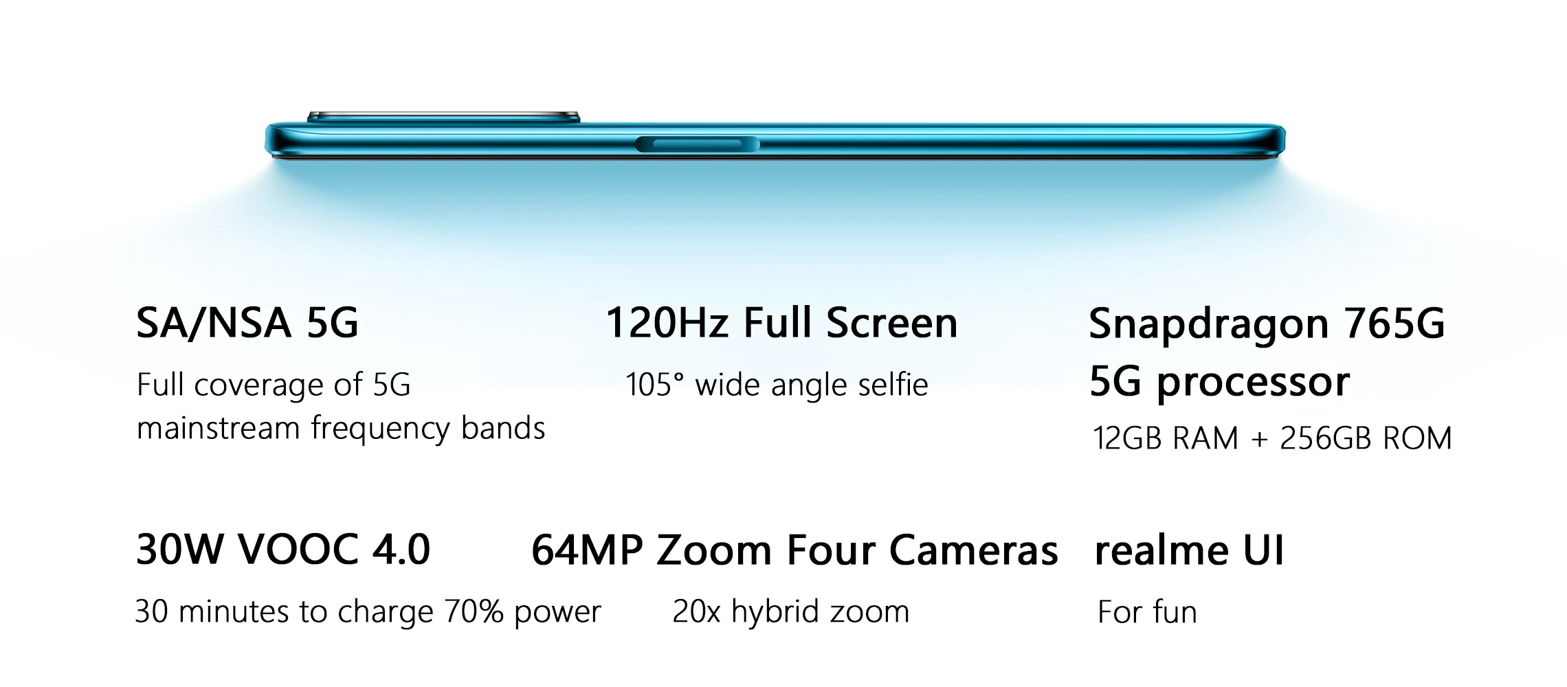 CPU: Qualcomm Snapdragon 765G Screen: 6.57 inch 1200Hz 2400*1080 full screenRAM+ROM: 8GB+128GB/12GB+256GBCamera: Rear: 64MP+12MP+8MP+2MP Front: 16MP+8MPSystem: realme UI based on Android 10Battery: 4200mAh (type)Quick charge: 30W VOOC 4.0Bluetooth: 5.0NFC: Yes,supportGoogle Play Store:Yes,supportLanguages: English,Russian,,Korean,Japanese,ectNetwork:5G NR:n1/n41/n78/n794G LTE FDD:B1/B2/B3/B4/B5/B7/B8TD-LTE:B34/B38/B39/B40/B413G WCDMA:B1/B2/B5/B6/B8/B19CDMA2000:BC0TD-SCDMA:B34/B392G GSM:850/900/1800/1900CDMA:BC0(800MHz)