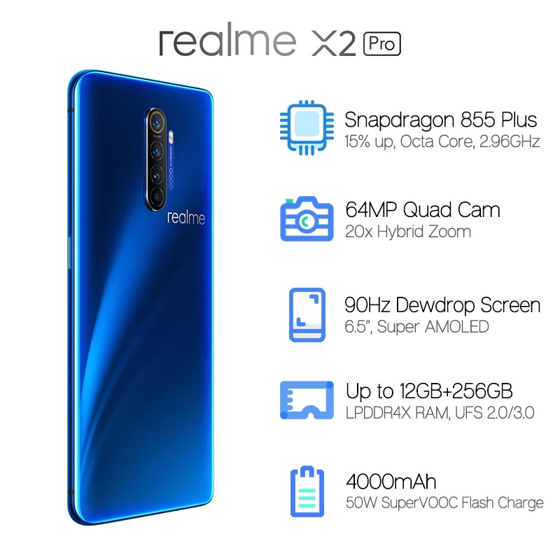 Original realme X2 Pro X 2 8GB 256GB 6.5'' Smartphone Snapdragon 855 Plus 64MP Quad Camera 90Hz Display NFC 50W VOOC Fast Charge